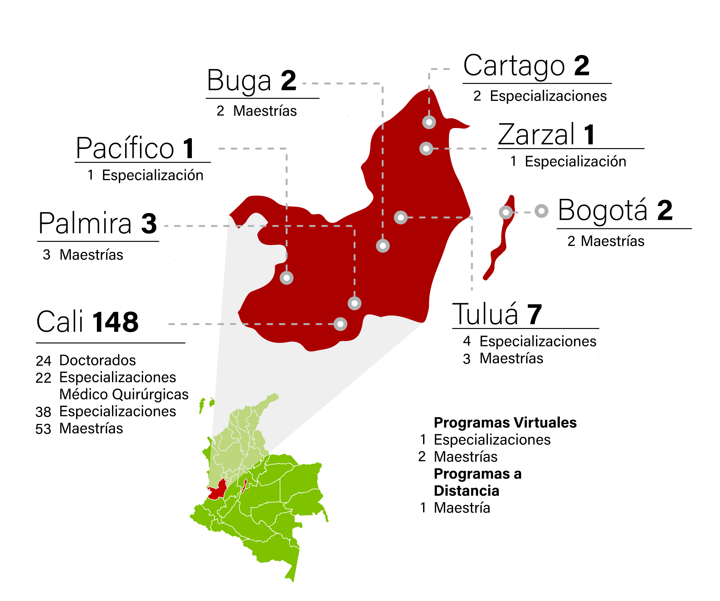 Nuestra oferta de Posgrados de Excelencia se extiende a nuestro sistema de regionalización, dictando programas académicos en Buga, Pacífico, Palmira, Tuluá, Zarzal y Cartago. Además, algunos de nuestros programas también son ofertados en Bogotá.